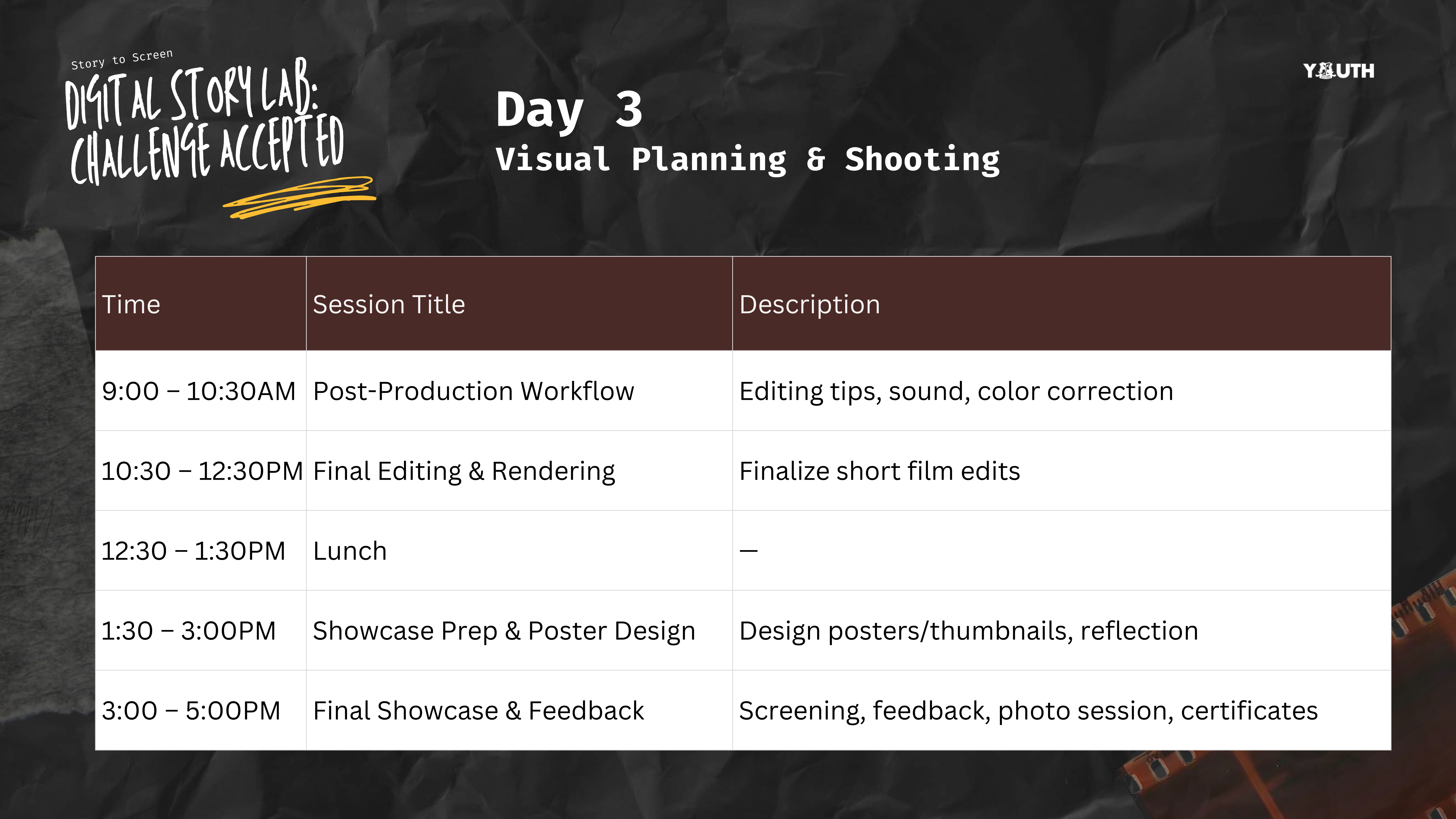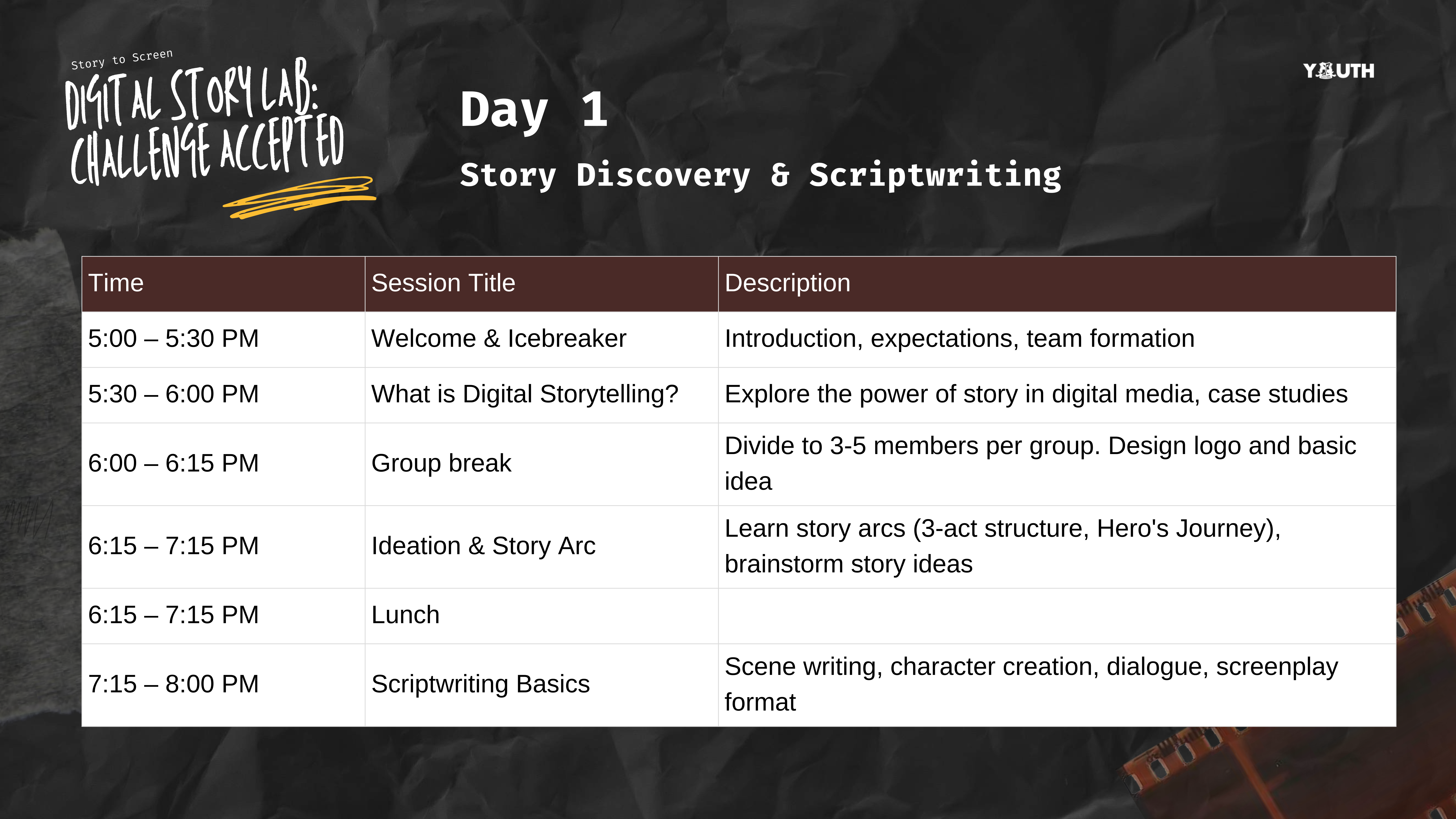 Story to Screen: Digital Story Lab: Challenge Accepted is a hands-on digital storytelling experience designed especially for youth and emerging creators aged 18 – 30 years old. Whether you’re a TikTok Junkie, Aspiring Filmmaker, or just someone with a message to share – this is your moment.
